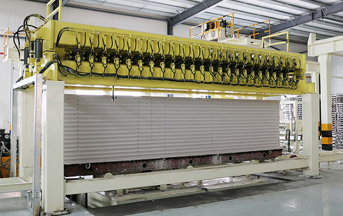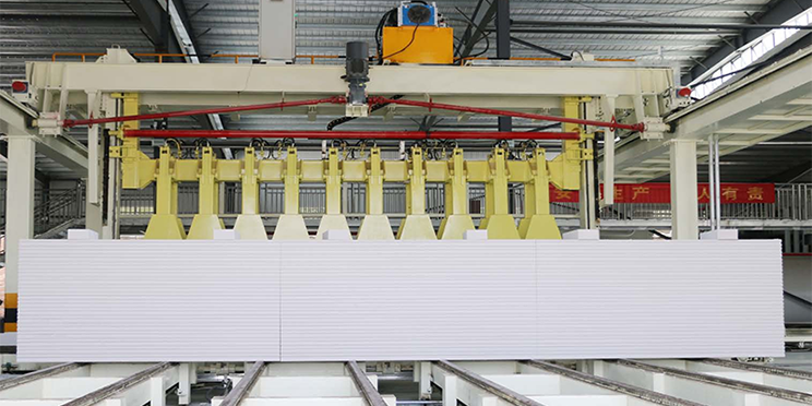 加氣板材經(jīng)過(guò)蒸壓釜,坯體獲得最終的強(qiáng)度和性能。出釜后的產(chǎn)品,通過(guò)東岳最新研發(fā)的掰板打包系統(tǒng),不但提高產(chǎn)品合格率同時(shí)解決了砌塊、板材同時(shí)分離的難題。