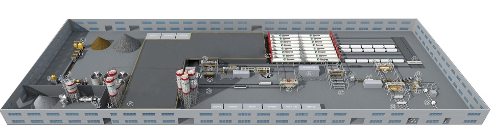 3、澆注工藝:采用固定澆注,模具移動(dòng)到澆注攪拌機(jī)下方,接受澆注后,自動(dòng)進(jìn)入能夠控制濕度和溫度的養(yǎng)護(hù)室,加速胚體的硬化。